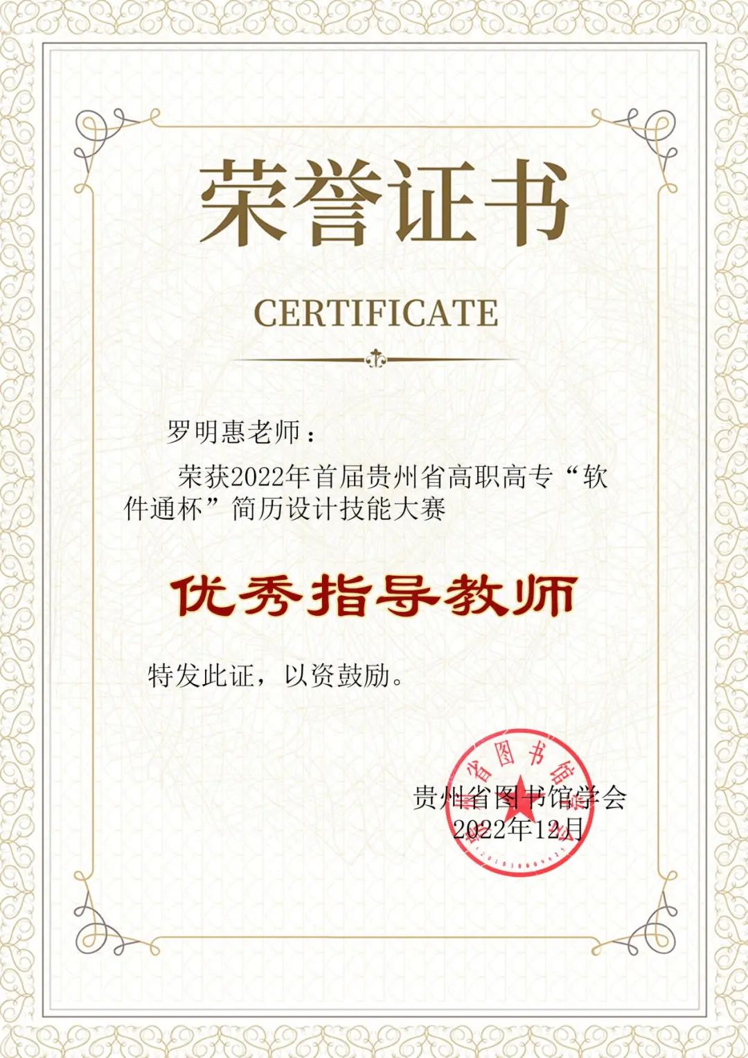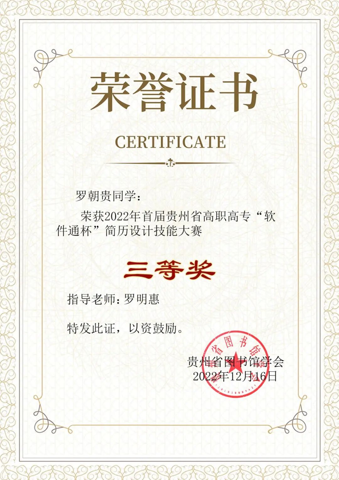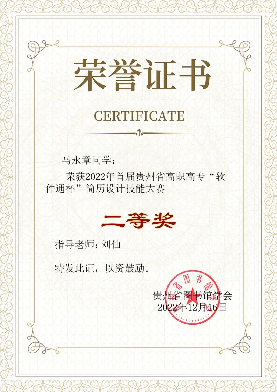 由贵州省图书馆学会主办,贵州省图书馆学会高职院校图书馆分会承办的2022年首届贵州省高职高专“软件通杯”简历设计技能大赛终审获奖结果公布。开云官网21级医疗设备2班马永章同学荣获二等奖,罗朝贵同学荣获三等奖。开云官网图书馆刘仙、机械工程系罗明惠两位指导老师荣获“优秀指导老师”称号。