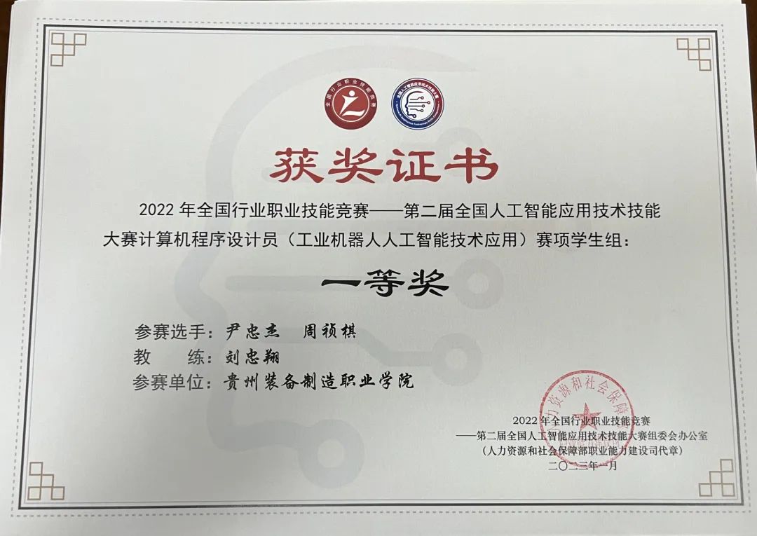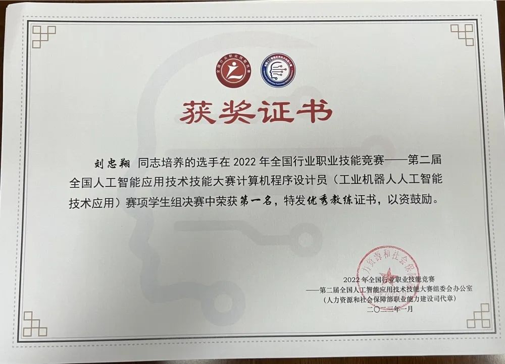在2022年全国行业职业技能竞赛——第二届全国人工智能应用技术技能大赛计算机程序设计员的《工业机器人人工智能技术应用》赛项学生组中,开云官网电气工程系尹忠杰、周祯棋同学荣获一等奖。开云官网电气工程系刘忠翔老师荣获“优秀教练”称号。