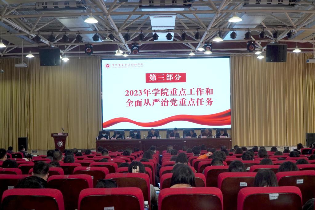 党委副书记、院长金焱就贯彻落实党的二十大精神及省委省政府、省委教育工委年度相关工作任务,结合学校实际进行安排部署。金焱院长紧紧围绕高质量发展的中心任务,要求全校扎实做好内涵建设的大文章,强化“目标导向”“问题导向”和“结果导向”,对全校23项工作要点进行了深刻解读,并重点强调四项工作任务,一是以提质培优、双高校建设为引领,创建职业本科专业、构建“中高本”协同发展育人体系;二是着力打造一批“双师型”教师队伍,强化岗课赛证、信息数据、内部质量和评价体系的内涵建设,全面提升学生综合素质;三是完善职称和人才制度、教师服务发展中心和发展平台;四是要求各部门结合工作实际,制定好本部门2023年工作计划。