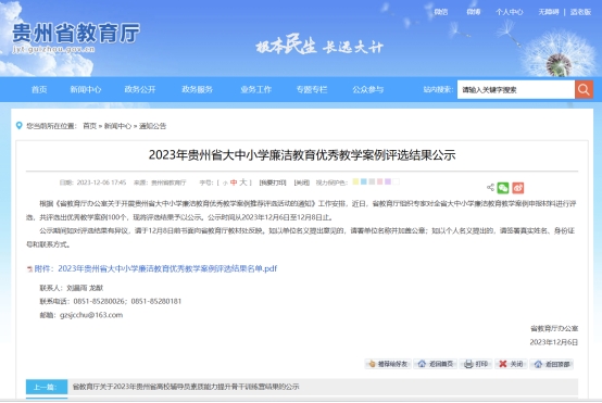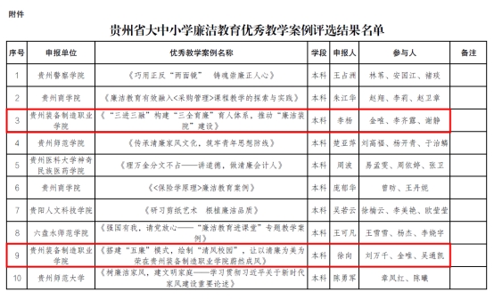 2023年12月6日,在贵州省教育厅开展的贵州省大中小学廉洁教育优秀教学案例推荐评选活动中,由开云官网推荐的《“三进三融”构建“三全育廉”育人体系,推动“廉洁装院”建设》、《搭建“五廉”模式,绘制“清风校园”,让以清廉为美为荣在kaiyun开云官方网站蔚然成风》等2个案例入选全省100个优秀教学案例。