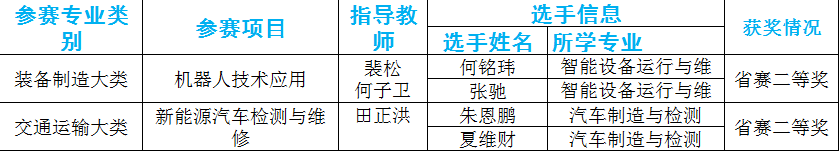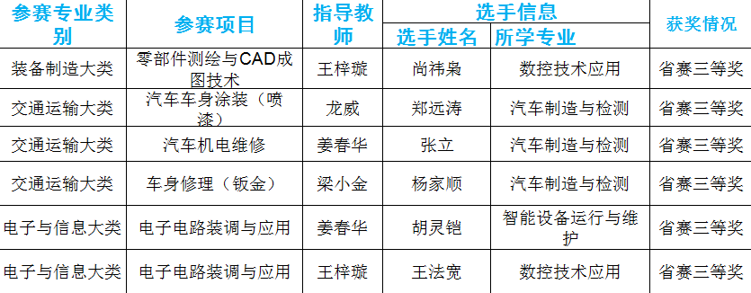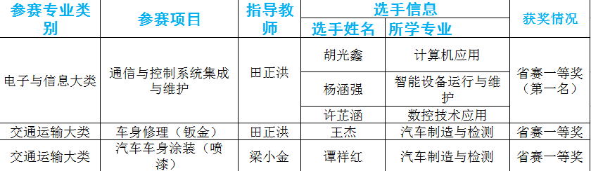 “通信与控制系统集成与维护”赛项(中职组)、“汽车车身涂装(喷漆)”赛项(中职组)、“车身修理(钣金)”赛项(中职组)均斩获贵州省省赛一等奖