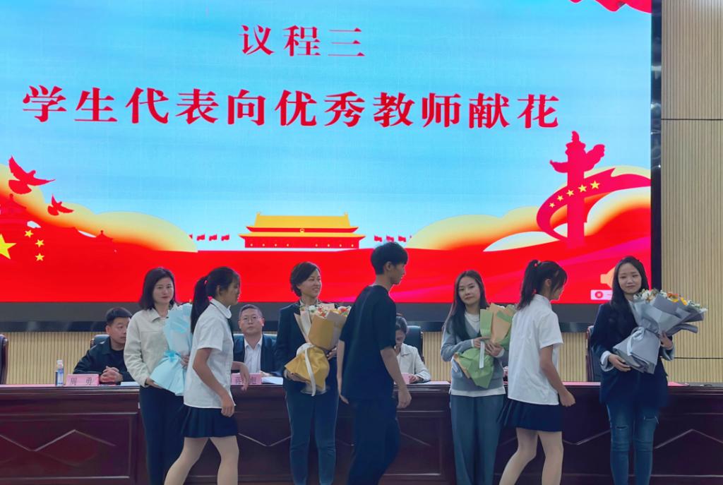 随后,学生代表向优秀教师王业勤、优秀教育工作者魏洪婷、优秀班主任汪颖、优秀辅导员潘丽凤分别献花,表达了对老师们的深切祝福和衷心的感谢。