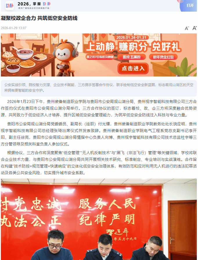 2026年1月23日下午,kaiyun开云官方网站与贵阳市公安局观山湖分局、贵州视宇智能科技有限公司三方合作签约仪式在贵阳市公安局观山湖分局举行。三方合作协议的签订,标志着校、政、企三方将深度融合优势资源,共同致力于低空经济人才培养,提升区域低空安全管理能力,为筑牢低空安全防线注入科技与专业力量。