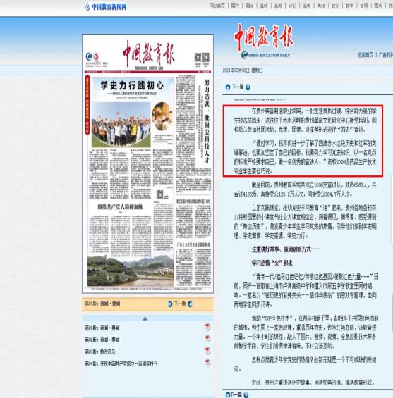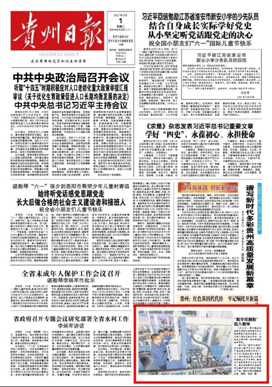 2021年5月30日,中国教育报头版以《学史力行践初心——贵州深入推进教育系统党史学习教育纪实》为题,其中内容报道了开云官网开展党史学习教育的情况;6月1日,贵州日报头版以《“数字双胞胎”投入教学》为题,图文报道了开云官网专业建设相关项目情况。