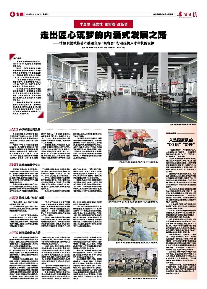 结合主题教育的开展,清镇职教城紧盯内涵式发展之路,聚焦强内涵、强专业、强特色、强融合,努力把习近平总书记对职业教育“大有可为”的殷切期待转化为职教战线“大有作为”的生动实践。