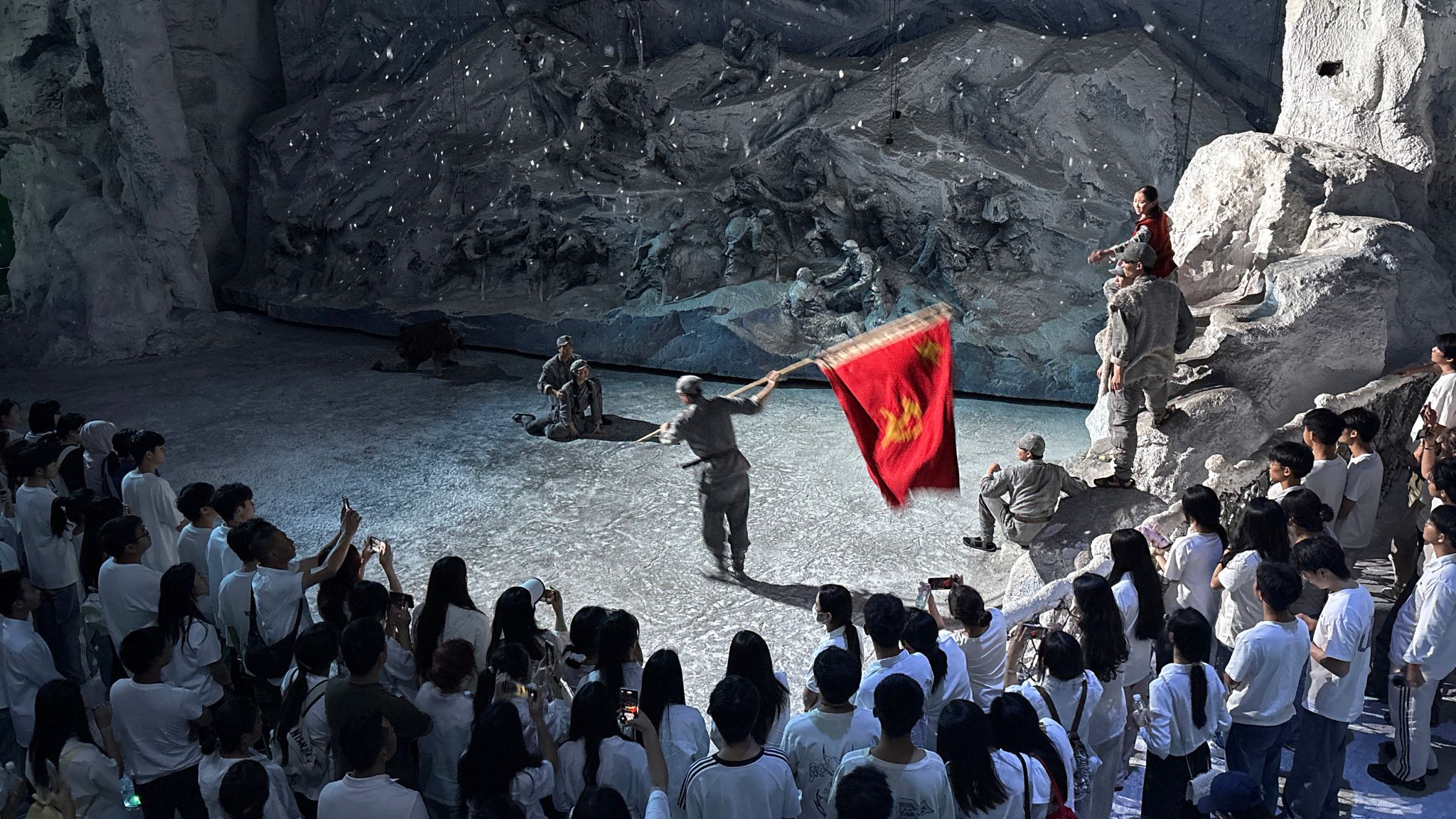 在“红飘带”展厅的数字剧场内,依托AI虚拟交互、全景剧场、全息影像与真人实景演绎等前沿技术,学生们化身历史见证者,亲历了湘江战役的悲壮、遵义会议的转折与四渡赤水的奇谋。虚拟的战火在眼前燃起,演员的呐喊在耳畔回响,同学们无不切身感受到革命先辈坚定的理想信念、无畏的牺牲精神和深厚的家国情怀。红色教育不仅要回望历史,更要立足当下、展望未来。研学活动的最后一站,同学们走进了“多彩飞越”体验馆,通过先进的球幕技术,沉浸式“飞越”贵州的大好河山。