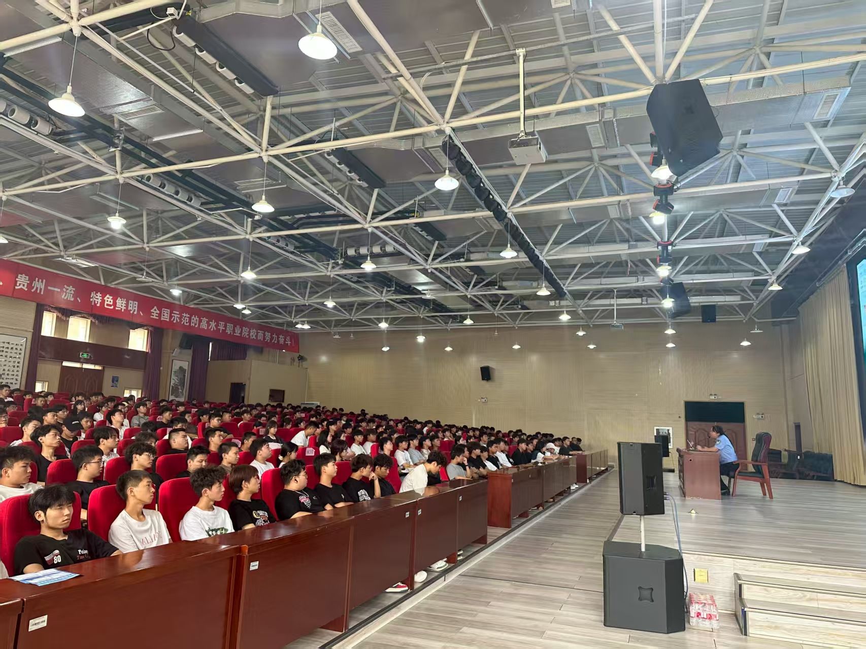 为贯彻落实《清镇职教城2025年秋季学期反诈护航行动工作方案》,提升2025级新生反诈能力,筑牢校园安全防线,开云官网昨日特邀清镇市公安局法治大队刘贤警官,在德润楼101会议室开展“反诈第一课”主题宣讲。本次讲座由保卫处工作人员主持,约400名学生宿舍寝室长参会。
