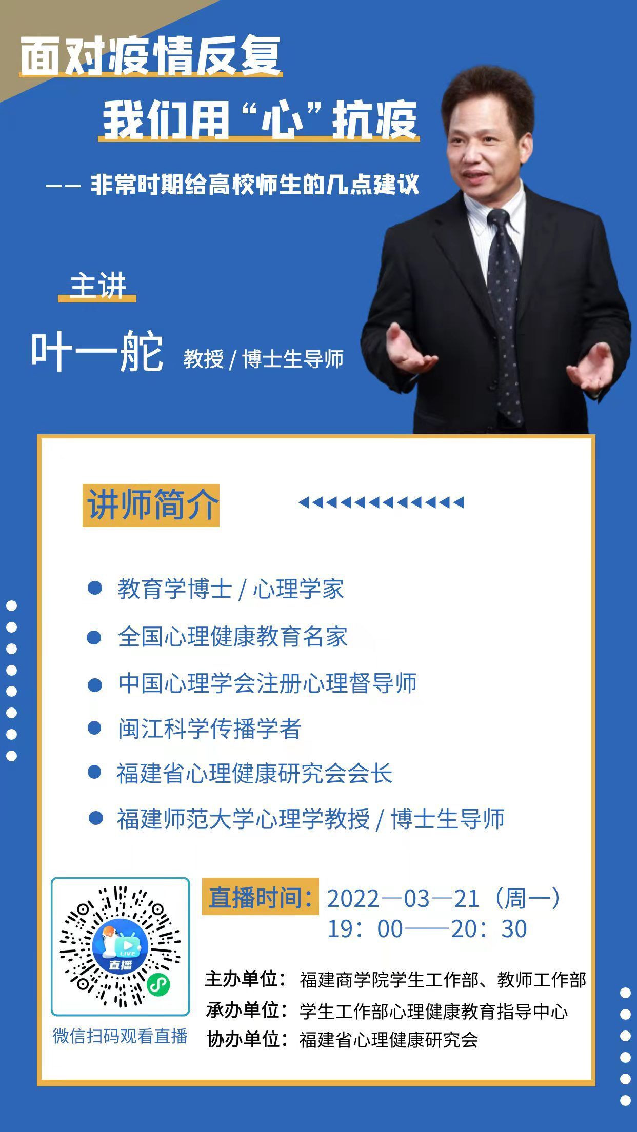 专家介绍:教育学博士、心理学家、全国心理健康教育名家、中国心理学会注册心理督导师、闽江科学传播学者、福建省心理健康研究会会长、福建师范大学心理学教授/博士生导师